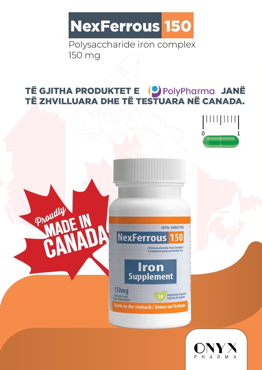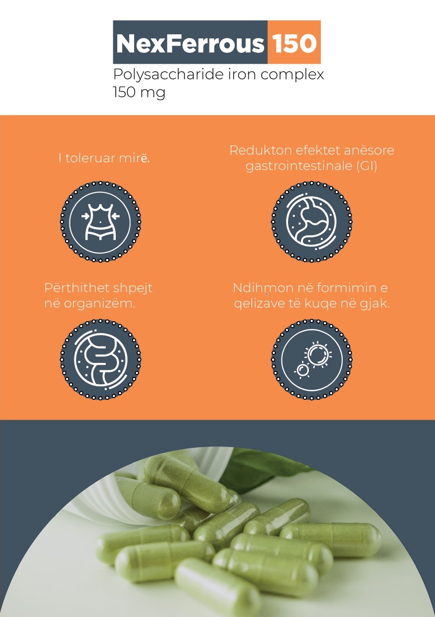 NexFerrous® 150 gjendet në paketim me 30 kapsula. Çdo kapsul përmban 150 mg kompleks hekuri polisakarid (hekur elementar). Merr 1 – 2 kapsula në ditë ose sipas nevojës në varësi të rekomandimit të mjekut apo farmacistit tënd